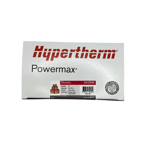This shield is for use with Hypertherm Powermax machines with a Duramax torch. This shield is intended for 15-85 amp drag cutting with a hand torch. Sold as single unit or 10 pack.